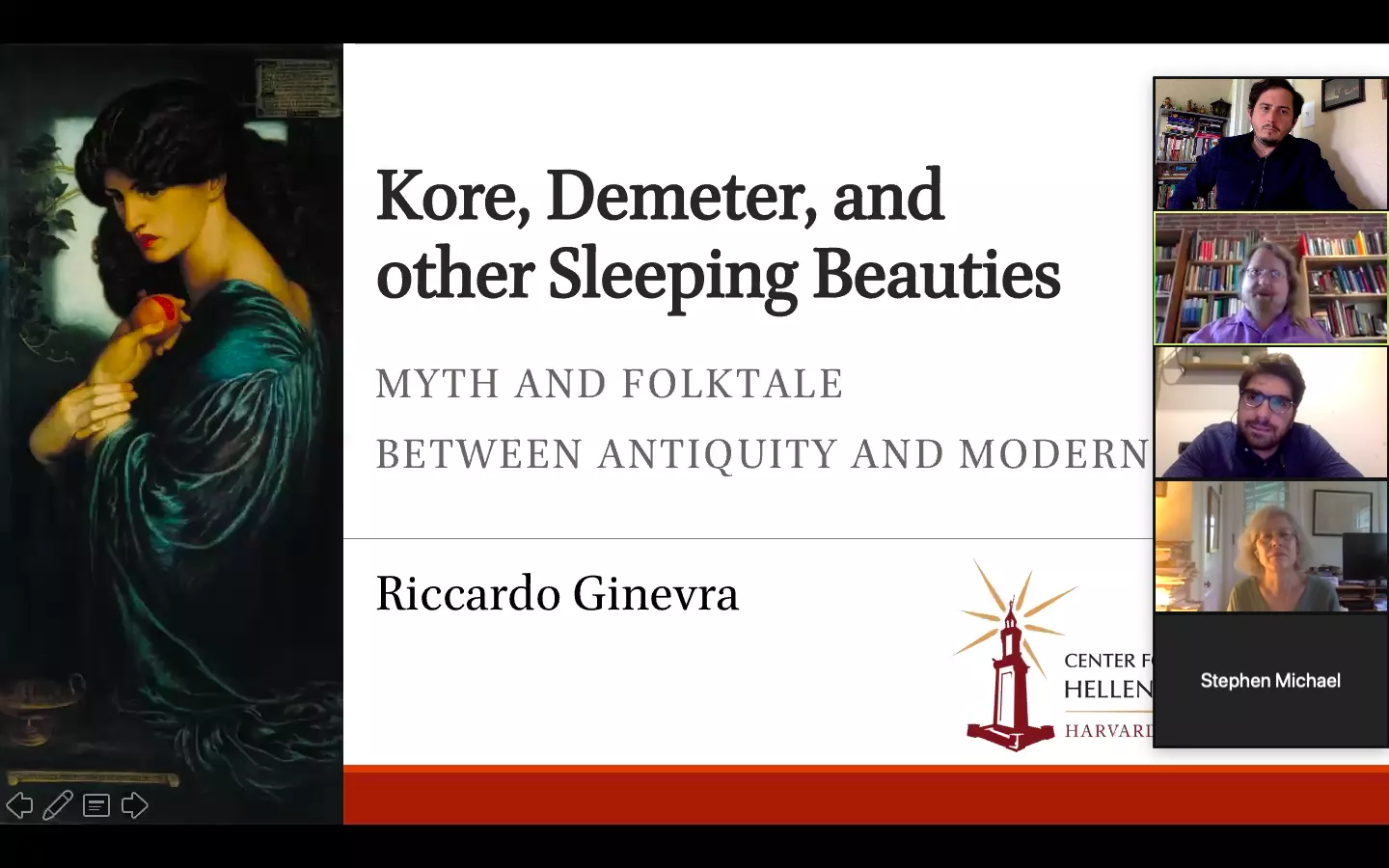 May 1 brought a lecture by Riccardo Ginevra from the University of Copenhagen. Dr. Ginevra spoke on “Kore, Demeter, and other Sleeping Beauties: Myth and Folktale between Antiquity and Modernity,” a cross-cultural literary analysis of themes of “sleeping beauties” in Scandinavian and Greek folk legends, and their potential Indo-European origins. This talk was recorded and is available here: Ginevra talk (password: 8d#!^*Bw)