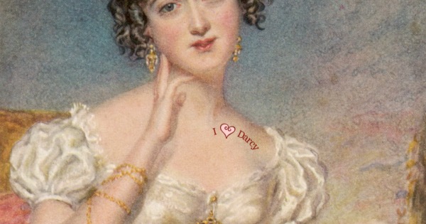 Regency period woman with "I heart Mr. Darcy" tattooed on shoulder.