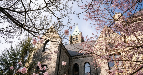 Taylor Hall with pink spring blooms
